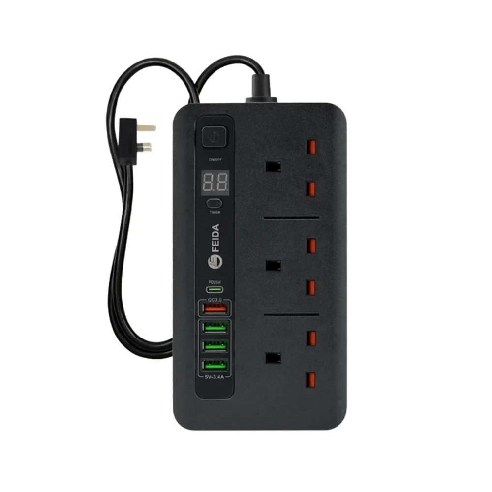 نقدم لكم توصيلة كهرباء ذكية ثلاثية التوصيلة من فيدا بعدد منافذ كافي وثلاث افياش تمكنك من استخدام وشحن عدة أجهزة في وقت واحد وتوصيلها بكل كفاءة ،